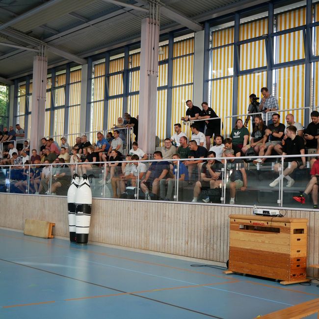 - Sporthalle mit Tribüne bis zum Spielfeld mit guter Beschallungsanlage