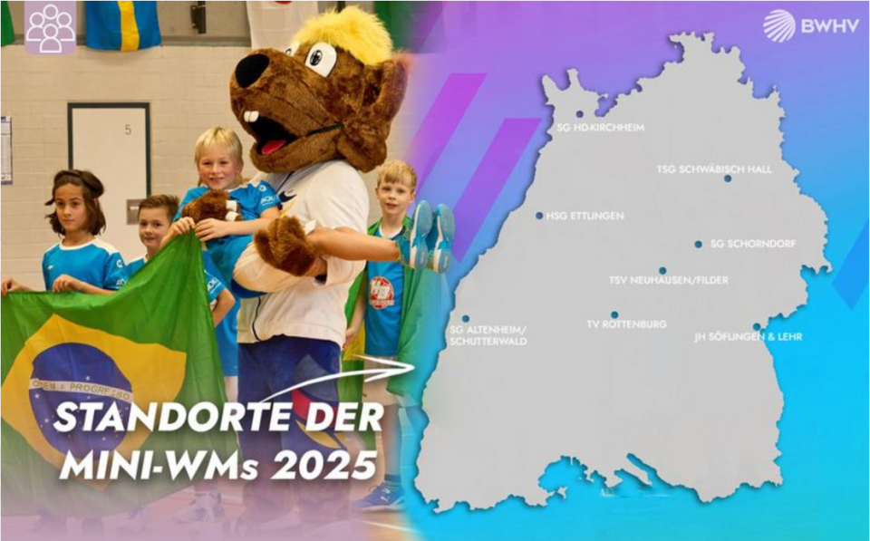 Unter dem Motto "HANDS UP FOR MORE" findet die Handball Mini-WM 2025 in Baden-Württemberg, in jedem der 8 Bezirke, zwischen September und November statt. Die Turniere sind für jeweils 32 Mannschaften ausgelegt und spielen den offiziellen Spielplan der Handball-Frauen-WM 2025 nach. Für die Gewinner der acht Bezirke gibt es am 29. November ein Finalturnier mit anschließendem Spielbesuch der Frauen-WM in der Porsche Arena in Stuttgart.